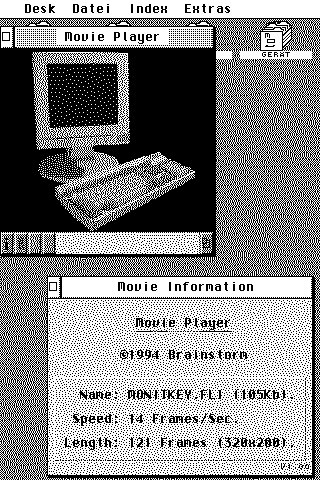 Auch im GEM-Gewand präsentiert sich ein französisches Programm, welches es als 68000- oder 680x0-Version gibt. Der MovielOO ist ausschließlich als Accessory nutzbar! Hervorragend ist das skalierbare Fenster, mit dem der Film daumennagelgroß oder bildschirmfüllend ablaufen kann. In einem weiteren Info-Fenster werden Informationen über Anzahl der Frames, die Filmgröße und Originalauflösung angezeigt. Mittlerweile wurde Player, oder besser ausgedrückt, die Abspielroutinen, in der Software Overlay/Flypermedia ([5], [6]) integriert. Ein Flandicap ist leider das RAM. FLIs, die größer als der momentan verfügbare Hauptspeicher sind, werden nicht geladen. Der Versuch wird, durch nicht wiederfreigegebenes RAM, bestraft d.h. ein Neu-Booten ist angesagt. Ein Bug, der in aktuelleren Versionen mit Sicherheit entfernt worden ist.