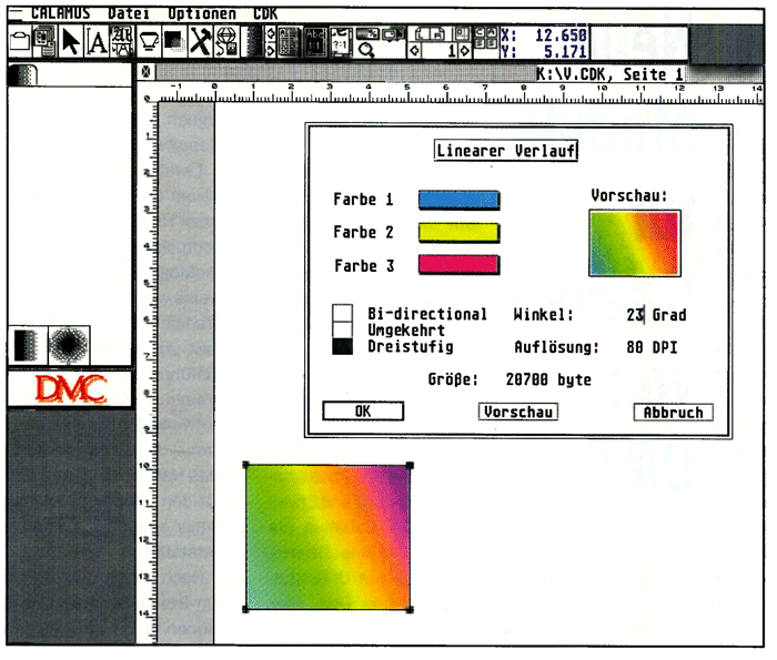 Neben dem bereits vorgestellten Line-Art 1.5 (STC 12/94) sind nun einige weitere Module von DMC erhĂ€ltlich, von denen wir heute zwei nĂ€her vorstellen wollen: âStereoMagicâ, ein Calamus-Modul zur Erzeugung von Stereogrammen sowie das âVerlaufsmodul', mit dem farbige PixelverlĂ€ufe direkt im Calamus-Dokument angelegt werden können. Die neuen DMC-Module laufen ĂŒbrigens ausschlieĂlich auf der Calamus '94er Version, die seit September letzten Jahres ausgeliefert wird.