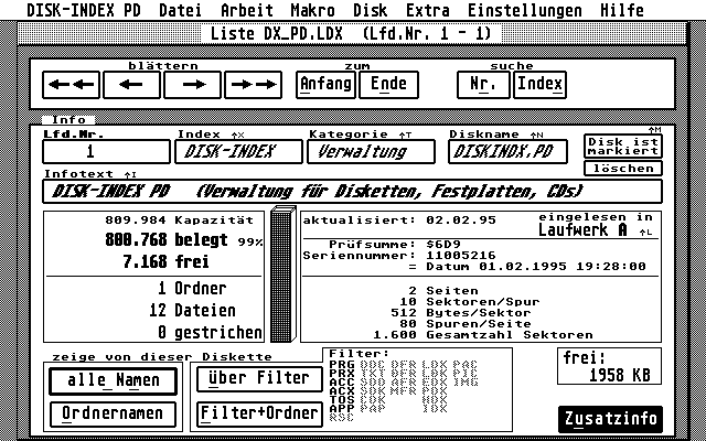 Wer kennt nicht den Ärger mit den übervollen Diskettenboxen und Diskettenstapeln auf dem Schreibtisch oder den immer verschachtelter werdenden Ordnerlabyrinthen auf der Festplatte? Oder man denke nur an die Dateienvielfalt auf CDs! Nach ein paar Monaten als Computerbesitzer sammeln sich soviel Disketten und Daten an, daß man schnell den Überblick verlieren kann. Abhilfe schafft das Programm Disk Index. Die hier besprochene PD-Version ist nur um ein paar Möglichkeiten ärmer als die Vollversion. Dazu aber am Schluß mehr.