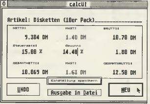 Die CeBIT machte es mal wieder deutlich: Die Megabyte-schweren Programme der Software-Giganten wachsen in ihrer Funktionsvielfalt immer noch weiter an. Und dabei sind es doch oft nur relativ kleine Aufgabenstellungen und Probleme, die im Alltag zu bewältigen sind! So stellt sich fernab allen Messetrubel sein kleines, aber feines GEM-Programm vor: calcül, das die Warenkalkulation bezüglich des Ein- und Verkaufspreises auf bestechend einfache Weise übernimmt. Das Programm läuft sowohl als ACC als auch als eigenständiges Programm in allen Auflösungen sowie selbstverständlich mit allen TOS-Versionen. Absolut GEM-konform in seiner Bedienung, macht es eine ausführliche Bedienungsanleitung eigentlich überflüssig. (Sie ist aber trotzdem vorsichtshalber noch vorhanden.) Analog zu großen Tabellenkalkulationen erfolgt bei Veränderung eines Zahlenwertes eine blitzartige Neuberechnung der übrigen Parameter (vgl. Abbildung). So läßt sich die Kalkulation eines günstigen Verkaufspreises auf denkbar einfachste Weise realisieren.