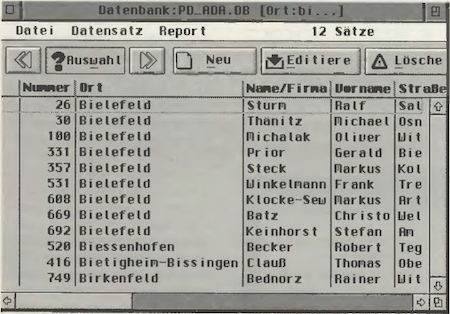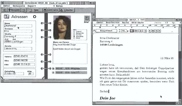 Eine alltägliche Anwendung einer Datenbank ist das Adressenerfassen. Spätestens zur nächsten Feier, zu der einige Freunde eingeladen werden sollen, soll mit der Datenbank ein Serienbrief erstellt werden. Wollte man kein zusätzliches Textprogramm zur Hilfe nehmen, bliebt bei einer Datenbank nur der Druck über die Drucker-Fonts. Daß dies im Zeitalter von skalierbaren Schriften nicht der große Hit ist, war jedem klar, der mehr aus seinen Serienbriefen machen wollte. TWIST 3 Office schafft mit seinem integrierten Textsystem hier Abhilfe.