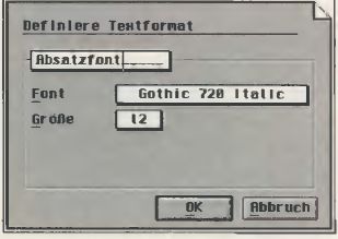 ln einer herkömmlichen Textverarbeitung wird zur Gestaltung eines Absatzes derselbe markiert und anschließend neue Informationen eingegeben. In der Praxis bedeutet dies folgendes: Man hat eine Überschrift, mehrere Absätze mit eventuellen Zwischenüberschriften. Dazu kommen vielleicht noch ein paar kleingedruckte Kommentare. In der Textverarbeitung XYZ heißt das nun, jedesmal den Font oder dessen Größe und Aussehen zu ändern, falls man einen anderen Textteil schreiben will. Ein nachträgliches Ändern von mehreren Seiten kann schnell zur Qual werden, wenn einem der Font nun gar nichtgefällt. Im TWIST-Textsystem wird beim Erstellen auch der entsprechende Bereich markiert und mit den Informationen aus einem Textformat verändert.