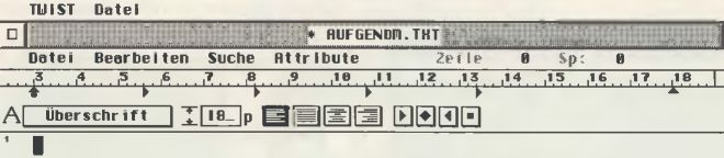 Dem erfahrenen TWIST-Anwender sticht sofort die Funktion ‘Lineale’ ins Auge. Wird diese aktiviert, erscheint im oberen Textsystemfenster ein Lineal mit diversen Icons und Symbolen.