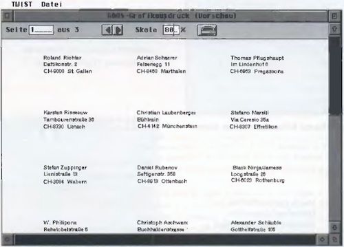 Als Reaktion auf den Wunsch vieler Anwender wurde ein längst überfälliges Feature in die TWIST-Reportfunktion eingebaut. Für Tabellen und Etiketten ist der mehrspaltige Druck unerläßlich. Will man sich nun für die anfangs erwähnten Einladungen das lästige Adressenschreiben erleichtern, ist es nun möglich, mehrreihige Etiketten mit Adressen oder anderen Informationen zu bedrucken. Es muß auch nicht viele Male mit den Etiketten probiert werden, da als Ausgabe des Reports die GDOS-Anzeige gewählt werden kann. Dabei wird in ein Fenster ‘gedruckt’, und man kann sich ein Bild von dem Ausdruck vor dem Papierdruck machen (Preview). In diesem Fenster kann nun zwischen den Seiten (bei mehrseitigem Ausdruck) geblättert und bei Bedarf stufenlos gezoomt werden. Bei Gefallen ermöglicht ein Icon den sofortigen Druck.