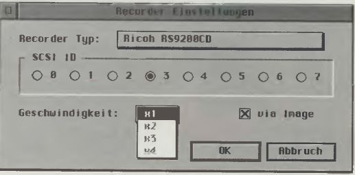 Die momentan unterstützten Modelle sind der Philips CD522 und der Ricoh 9200CD. Weitere Modelle (Sony, JVC, Yamaha, Kodak, Reflex) sind gerade in Arbeit und dürften in wenigen Wochen erfaßt worden sein. Eingestellt werden muß neben der SCSI-ID die Schreibgeschwindigkeit des Recorders. Dies geht von einfach bis vierfach. Die Transferraten sind ein Abbild der Transferraten bei den CD-Laufwerken. Ein 4fach-Schreiber schaufelt die Daten also mit600 KB/secauf die CD. Das Kreuzchen bei ‘via Image’ entscheidet über die schon beschriebene Möglichkeit zur Direktbeschreibung. Alternativ kann als Recorder auch eine Image-Datei angegeben werde, wobei die SCSI-ID und ‘via Image’ überflüssig werden.