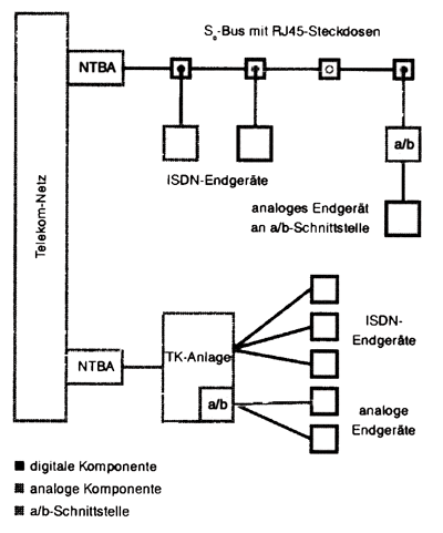 Der Mehrgeräteanschluß verbindet die ISDN-Endgeräte über den S0-Bus direkt mit der Vermittlungsstelle der Telekom. Zusätzliche Möglichkeiten bietet eine TK-Anlage am Anlagenanschluß (unten), die wie eine hausinterne Vermittlungsstelle arbeitet. Über a/b-Schnittstellen können auch alte Analoggeräte am ISDN-Anschluß betrieben werden.