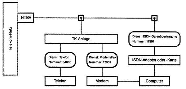 Mit einer von der Telekom geförderten TK-Anlage am Mehrgeräteanschluß ist der Einstieg ins ISDN besonders günstig. An den a/b-Schnittstellen der Anlage können die vorhandenen Geräte weiterbetrieben werden, und mit einem ISDN-Adapter für den Computer sind zusätzlich ISDN-Datenübertragungen möglich. Mehrere Geräte (hier Modem und ISDN-Adapter) können auf derselben Rufnummer betrieben werden, da sie mit Hilfe von Dienstekennungen unterscheiden, für welches von ihnen ein Anruf bestimmt ist.