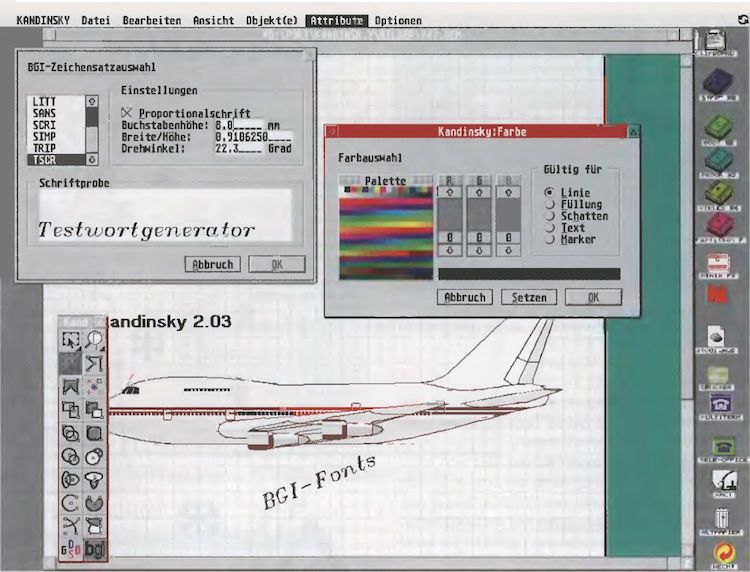 Damit das Konzept des objektorientierten Zeichnens auch durchgehend anwendbar ist, kommt Kandinsky als zeitgemäßes Programm natürlich auch mit den Vektorschriften des ATARI Speedo GDOS und der aktuellen NVDI-Version klar. Besitzen Sie eines dieser Systemprogramme, können Sie Schriftzüge frei in Ihre Zeichnungen einpassen, ohne Qualitätsverluste beim Dehnen oder Stauchen in Kauf nehmen zu müssen. Aber auch Benutzer ohne neue GDOS-Versionen bleiben nicht außen vor. Das eingebaute BGI-System macht's möglich. Dieses Kürzel steht für „Borland Graphics Interface“, welches die Routinen zum Umgang mit frei skalierbaren Zeichensätzen umfaßt. Der Hersteller liefert zusammen mit Kandinsky 10 BGI-Schriften aus, die den Grundbedarf vor allem technischer Zeichnungen decken dürften.
