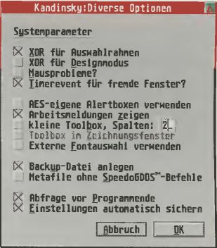 Man merkt es Kandinsky an, daß in dem Programm langjährige Entwicklungsarbeit steckt. Neben der Implementation neuer, komplexer Funktionen und der Weiterentwicklung schon vorhandener legt der Autor offensichtlich Wert auf reibungslose Kooperation seiner Software mit den neuesten Versionen der Systemsoftware und die Ausnutzung neuer Programmstandards. Dies drückt sich auch in der Liste der unterstützten Systemerweiterungen, wie beispielsweise Fontselektoren, aus; eine komplette Aufzählung würde den Rahmen dieses Artikels sprengen. Wir halten das Programm für sehr ausgereift und sprechen eine eindeutige Empfehlungaus, besonders in diesem Fall das Shareware-Konzept zu unterstützen. Nicht zuletzt erhält der ehrliche Anwender ein sauber strukturiertes, umfangreiches Handbuch.