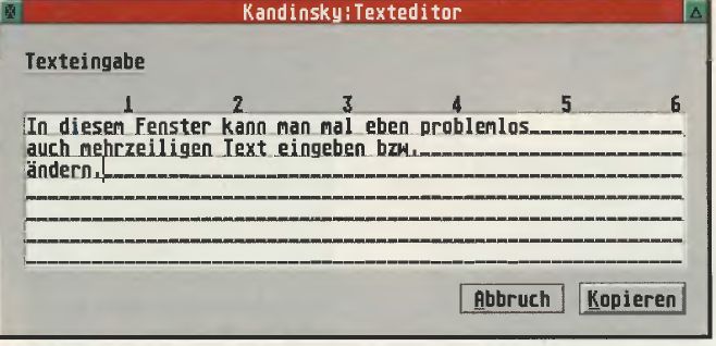 Läßt schon die Vielfalt der Zeichnungselemente kaum etwas zu wünschen übrig, so beeindruckt die Liste der durch die Bearbeitungsmodi möglichen gestalterischen Mittel um so mehr. Selbstverständliche Optionen, wie das Dehnen und Stauchen und die Plazierung von Objekten, sind aufgepeppt durch komfortable Kontrollmöglichkeiten. So läßt sich beispielsweise eine Koordinatenanzeige zuschalten, die über den prozentualen Wert der Größenänderung oderden Verschiebungsvektor informiert. Aber auch ein Raster können Sie aktivieren, welches die Modifizierungen in festgelegten Grenzen hält. Daß sich der Autor Ulrich Roßgoderer mit dem aktuellen Stand der Software auf dem ATARI auseinandersetzt, wird an nützlichen Details wie dem Drag&Drop-Verfahren deutlich. Hierdurch können Sie nicht nur Objekte zwischen verschiedenen Zeichnungen innerhalb Kandinskys per Mausbewegung kopieren, sondern auch den Austausch mit anderen Applikationen pflegen, welche diesen neuen Standard unterstützen. Fast schon selbstverständlich, dennoch erfreulich, ist die Unterbringung aller Dialogboxen in Fenstern. Multi TOS- und MagiC-An-wenderwird das freuen, blockiert doch eine derartige Dialogbox nicht alle weiteren Programme. Ein anderes Feature von Kandinsky, die Benutzung des Clipboards zum Austausch mit anderen Applikationen, wird dadurch noch aufgewertet. Selbst innerhalb der Dialogboxen lassen sich Objekte oder Text einfügen. Besonders für den eingebauten Mini-Texteditor, mit dem Sie unkompliziert und schnell auch mehrzeiligen Text eingeben können, ist das ein Plus.