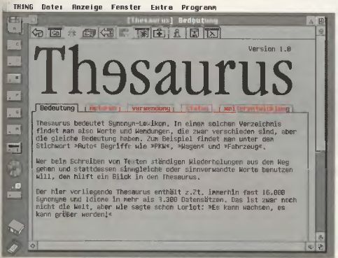 Auf der Diskette befindet sich neben dem Hypertext und der Datenbank natürlich auch die aktuelle Version von ST-Guide. Den Thesaurus erhalten Sie gegen Einsendung von DM 20,-(Scheck oder Schein). Bitte geben Sie bei der Bestellung an. ob Sie eine DD-oder eine HD-Diskette wünschen.