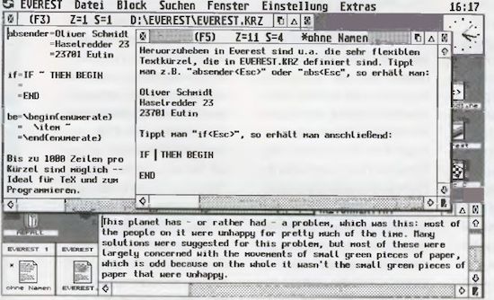 Für Vielschreiber bietet Everest die Kürzel-Funktion an. Diese eignet sich auch gut für Programmierer. Die Kürzel stehen in einer eigenen Datei, die sich jeder selbst erstellen muß. Jede Zeile einer solchen Datei enthält einen Eintrag. Zum Beispiel die Formulierung ‘Sehr geehrte Damen und Herren’. Steht im Text das Wort ‘Sehr’ oder ‘Se’ und drückt man die Escape-Taste, wenn der Cursor direkt vor diesem Wort steht, so wird das Wort durch das Kürzel ersetzt. Die Verwendung der Tilde ‘~‘ in einem Kürzel bestimmt die Cursor-Position nach erfolgtem Einsetzen des Kürzels.