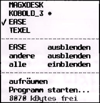 Flat man sich erstmal mit dem Gedanken angefreundet, Programme parallel zu benutzen, muß man auch die Frage klären, wie man von einer Anwendung in die andere kommt. Hier hat sich gegenüber den Vorgängerversionen nicht viel verändert. Nach wie vor kann man sich mit der Control-Alternate-Tabulator-Tastaturkombination nacheinander durch die verschiedenen laufenden Programme schalten. Hat man sich die Kombination erst einmal gemerkt, ist das eine schnelle und bequeme Art, sich durchs System zu bewegen .Auch den Taskmanager (Verwalter aller laufenden Programme) bringt man immer noch mit der Kombination Control-Alternate-ESC ans Tageslicht. Schade nur, daß den Benutzern des Desktop-Ersatzes Gemini dieser Weg bis heute Sorgen macht, weil der Taskmanager dort (auf Grund der Ausgabeumlenkung ins Fenster) innerhalb des Konsolefensters erscheint und die nachfolgenden Redraws etwas durcheinander gebracht werden. Noch unangenehmer wird's, wenn die Konsole geschlossen ist, denn dann kann man den Taskmanager sogar nicht mehr sehen (sehr wohl aber noch über Tastatur blind bedienen). Dem mitgelieferten MagiCDesk oder der EASE (ebenfalls ASH) bereitet das keine Schwierigkeiten, weil sie von Haus kein Konsolefenster anbieten, sondern sich ganz auf den bei MagiC! mitgelieferten VT52-Emulator stützen.