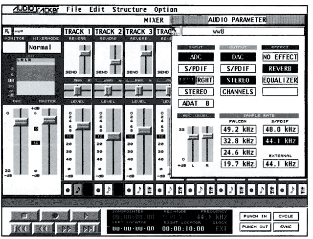 Obwohl Audio Tracker keine MIDI-Daten verarbeitet, ist es dennoch möglich, diese mit einem zweiten ATARI, auf dem z.B. Cubase läuft, zu synchronisieren. Audio Tracker sollte dann als Master fungieren und der Sequenzer-ATARI als Slave. Nun lassen sich die vertrauten MIDI-Files sogar mit Gesang versehen und direkt auf Band sichern. Selbstverständlich lassen sich auch die Expander-Audiodaten samplen (digitalisieren) und über das S/PDIF Interface auf DAT-Recorder bannen. Da Audio Tracker über die Send/Receive-Audio-Code-Funktionen verfügt, ist es sogar möglich mehrere Falcons miteinander zu synchronisieren, um ein 16- oder sogar 32Spur-HDR-System zu realisieren. Was ein solches System vor 10 Jahren gekostet hätte, wage ich erst gar nicht nachzurechen.
