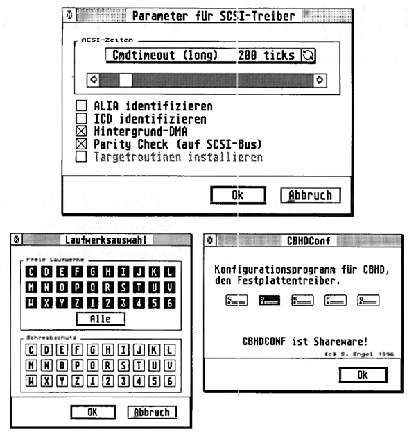 Weiterhin liegt ein Konfigurationsprogramm bei, mit dem die Parameter des Treibers eingestellt und Platten formatiert und partitioniert werden können. Leider sind noch nicht alle vorgesehenen Funktionen integriert, aber alles Wesentliche ist bereits parametrierbar.