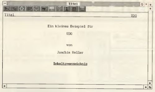 Da UDO auch für andere Betriebssysteme (Linux, HP-UX, MacOS, MS-DOS, Sl-NIX, Sun Spare ...) erhältlich ist, könnten Texte mit allgemeinem Inhalt auch als Quelltext weitergegeben werden, so daß Benutzer von UDO, die keinen TOS-Rechner besitzen, auch in den Genuß so mancher Information im gewünschten Format kommen können. UDO hält in der derzeit erhältlichen Version über 100 Befehle bereit, mit denen man einen Quelltext „programmieren“ kann. Allerdings braucht man für die Erstellung eines kleinen Textes lediglich ein paar Befehle zu kennen. Daher hier eine Minimalversion eines Quelltextes, der eine Titelseite, ein Inhaltsverzeichnis und ein Kapitel enthält und mit lediglich 8 Befehlen (UDO-Befehle beginnen mit einem Ausrufungszeichen) erstellt wird: