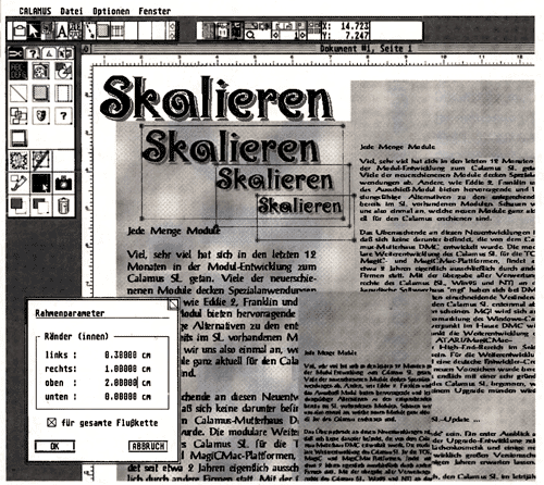 Anders als beim letztjährigen Update wird es diesmal erfreulicherweise wieder nur eine einzige Version des Calamus SL geben, lauffähig sowohl auf TOS/MagiC als auch unter MagiC-Mac auf Macs (68K) und PowerMac. Nachdem der Versuch scheiterte, den Calamus SL im letztjährigen Update auch für lange Dateinamen zu öffnen, soll diese Anpassung an den gängigen Standard nun fest in die Calamus-Auswahl integriert werden. Wie bereits in den Calamus-Versionen unter Windows wird auch der SL ein zeitgemäßes Design der Benutzeroberfläche erhalten, wozu unter anderem eine verschiebbare Modulleiste (für den direkten Zugriff auf alle geladenen Module), Dialoge in Fenstern und Pop-up-Menüs gehören werden.