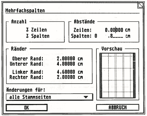 Die Hilfslinien für Mehrfachspalten können nun über eine Vorschau sicher beurteilt werden. Die Auswirkung jedes eingegebenen Wertes wird sofort in der Übersicht dargestellt.