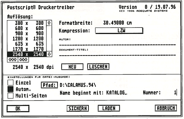 Um auch hohe Auflösungen aus Calamus auszugeben, die bisher eigentlich nur durch das optional erhältliche „Job-Modul" ermöglicht wurden, mag man sich eines kleinen Tricks bedienen: Den neueren Calamus SL-Versionen liegt standardmäßig ein kleines Modul, das „Dummy Job-Modul“, bei. Dieses Modul ist jedoch alles andere als „dummy“. In den Calamus geladen, ermöglicht es die problemlose Ausgabe auch in Auflösungen größer als 650 bzw. 760 dpi, je nach Calamus-Version, für Belichtungen und Ausdrucke. Im PS-Export-Modul wie auch im TIFF-Treiber befindet sich zum gleichen Zweck ein kleines Modul im Lieferumfang, das die Auflösungsbegrenzung für die Ausgabe aufhebt. Der Post-Script-Export-Treiber ist bei adequate Systems für 600,- DM erhältlich.
