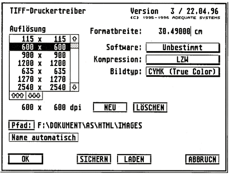 Geladen wird der Druckertreiber ganz normal im Druckerdialog. Die für die Ausgabe gewünschte Auflösung kann in einem eigenen TIFF-Parameterdialog frei eingestellt und in einer speicherbaren Liste abgelegt werden. In diesem Formular können zusätzlich Vorgaben für diverse Programme angegeben werden, um deren jeweilige Einschränkungen beim Import zu berücksichtigen. Ausgegeben wird dann die komplette Calamus-Seite, mit eingestellten Rastern, Passer-und Schnittmarken sowie Separationseinstellungen.