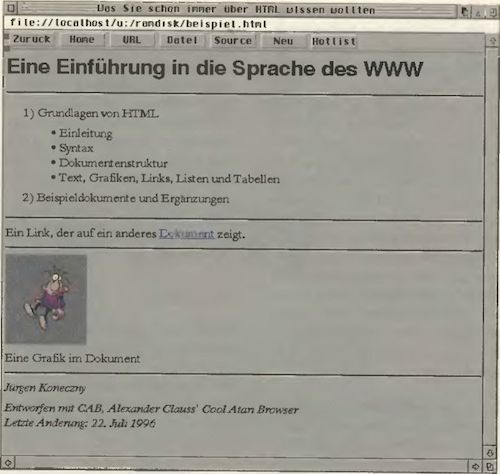 HTML selbst entwickelt sich sehr schnell weiter. Zur Zeit wird vom W3C (WWW Consortium) der Standard für HTML 3.2 erarbeitet. Unter http:// www.w3.orgfinden Sie zur Standardisierung weitere Informationen. Der hier verwendete „Referenz-Browser" ist CAB, der zumindest HTML 2.0 beherrscht. Der Autor Alexander Claus ist bemüht, die meisten, teilweise proprietären Erweiterungen, über die Netscape gegenüber HTML 2.0 verfügt, zu implementieren. Diese Einführung hat daher nicht den Anspruch „Standard-Konform" oder vollständig zu sein, sondern will vielmehr dem Leser die Grundlagen von HTML näher bringen, um mit bzw. für CAB HTML-Dokumente zu erstellen.