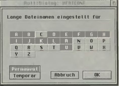 Zu beachten ist, daß dazu „VFAT-CONF.PRG“ im Ordner: „C:\GEMSYS\ MAGICNSTART“ liegen und außerdem korrekt konfiguriert sein sollte. Dazu startet man VFATCONF.PRG manuell und stellt die benötigten Laufwerke ein. Man kann lange Dateinamen auf allen installierten Laufwerken außer „C:\“ permanent (oder optional auch temporär, also bis zum nächsten Reset) einrichten, also: A:, B:, D:, E:\ ... etc. Bei Bedarf kann man auch gewisse Laufwerke davon ausnehmen. Prinzipiell bietet es sich an, alle vorhandenen Laufwerke mit Zugriff auf lange Dateinamen zu versehen, da durch MagiC 5.0 auf dem ATARI und unter MagiCMac und MagiC-PC lange Dateinamen immer populärer werden.