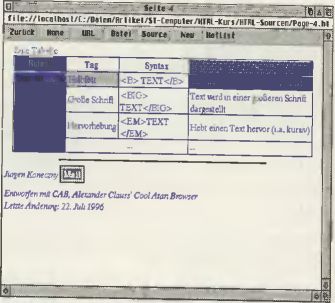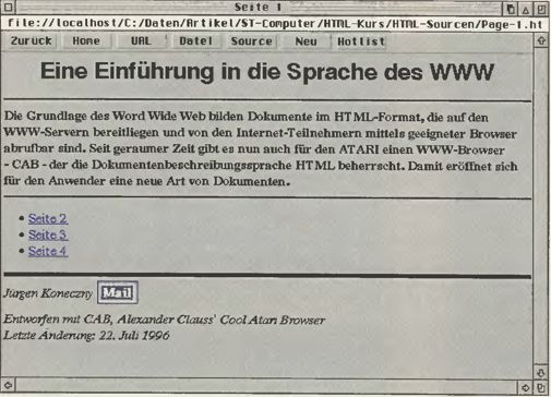 Die Grundlage des Word Wide Web bilden Dokumente im HTML-Format,die auf den WWW-Servern bereitliegen und von den Internet-Teilnehmern mittels geeigneter Browser abrufbar sind. Seit geraumer Zeit gibt es nun auch für den ATARI einen WWW-Browser - CAB - der die Dokumentenbeschreibungssprache HTML beherrscht. Damit eröffnet sich für den Anwender eine neue Art von Dokumenten.