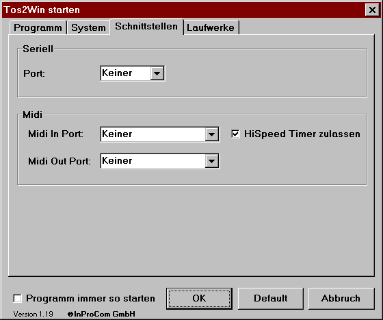 Da moderne PCs unter Umständen mehrere serielle Ports besitzen, haben Sie unter TOS2WIN die Möglichkeit, frei einzustellen, welcher der Ports von ATARI-Programmen als serieller Port verwendet werden soll. Beachten Sie bitte, daß Sie nur nicht belegte Ports verwenden. Die meisten PCs belegen den Port C0M1 mit der Maus.