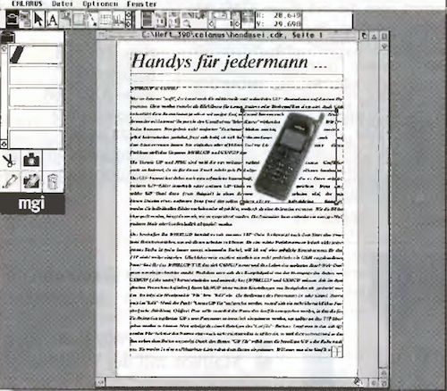 Der Vektorrahmen wird nun dort plaziert, wo später das Handy abgebildet werden soll. Schalten Sie nun innerhalb Calamus auf die Eigenschaften für Textrahmen. Hier können Sie einstellen, welchen Abstand der Text von der Grafik haben soll. Ist dies geschehen, betätigen Sie den Button zum Aktivieren des Fließmodus. Achten Sie darauf, daß sowohl der anzupassenden Text- als auch der Vektorrahmen gleichzeitig aktiviert sind, da Calamus ansonsten eine Fehlermeldung ausgibt.