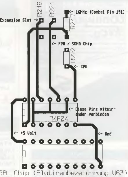 Dazu muß kurz vor dem Pin 110 vom SDMA Chip (Platinenposition U36 unterhalb des Diskettenlaufwerkes) die Leiterbahn vorsichtig durchtrennt werden, wobei auch der grüne Lötstoplack vorsichtig auf der Seite zum SDMA Chip hin entfernt werden muß. Nun muß eine eventuell sogar abgeschirmte (die Abschirmung dieser Leitung nur an einer Seite mit der Masse der Hauptplatine verbinden durch Löten, niemals eine Abschirmung an beiden Seiten anschließen, da ansonsten ein Störstrom innerhalb der Abschirmung durch Potentialdifferenzen entstehen kann, welcher unerfreulicherweise wiederum eine Störspannung auf die Signalleitung des abgeschirmten Kabels induzieren könnte!) Leitung vom Punkt SDMA Chip am 74F04 IC zu dieser freigelegten Leiterbahn verlegt und angelötet werden.