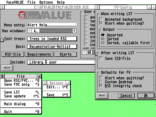 faceVALUE (kurz: FV) ist - neben dem ACS für Pure C/Pascal -, eine Umsetzung dieses Konzept für GFA-Basic. Der größte Unterschied ist der, daß faceVALUE nicht aus einem Guß ist, wie z.B. Visual Basic. Das bedeutet, das ein Resource-Editor und natürlich GFA-Basic benötigt wird. Mit den v1.0 und 1.1 wurde dieses Konzept bereits gut umgesetzt. Nach einer langen Durststrecke und vielen Ankündigungen gibt es jetzt v2.1. Da man über FV mittlerweile ein ganzes Buch schreiben könnte, bleibe ich weitgehend bei den Neuheiten. Für denjenigen, der FV noch nicht kennt, sind die GFA-Basic-Hypertexte empfehlenswert. Ebenso ist eine Demoversion von FV angekündigt.