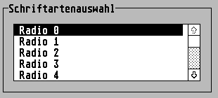 Eines der Objekttypen, die ich in FV 1.1 vermißte, sind die offenen Listboxen. Zwar bedeuten sie keinen Zuwachs an Funktionalität, aber in bestimmten Fällen können sie die Übersichtlichkeit steigern. So ist eine Fontauswahl mit offenen Listboxen sinnvoller, da mehr Optionen auf einmal sichtbar sind. Sie sind jedoch nicht tastaturbedienbar und es gibt leider keinen horizontalen Verschiebebalken.