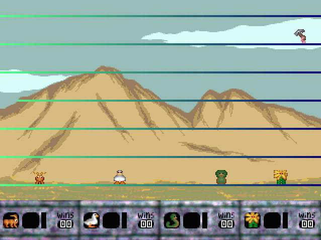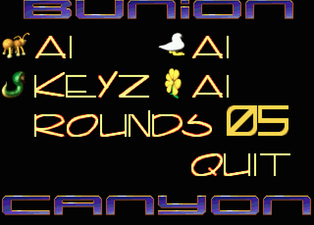 Die RESERVOIR GODS tragen natürlich wieder dicker auf. Ihr Beitrag nennt sich „BUNION CANYON“ und ist mal wieder komplett durchgestylt. Bis zu vier Spieler können teilnehmen oder man läßt die „freien“ Figuren von der eingebauten „AI“ (zu deutsch: künstliche Intelligenz) steuern. Das Spielprinzip sieht etwas nach frühem 64er aus und macht auch dementsprechend Spaß. Der gute Eindruck wird mal wieder durch ein schickes Menü, augenfreundliche Grafik (im Menü gibt es sogar ein paar gerenderte Animationen) und Musik abgerundet, halt ein rundes Ding.