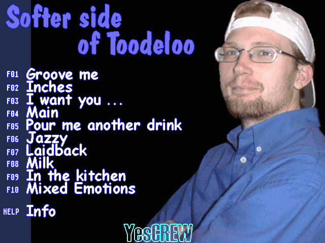 Für Musik-Demo-Freunde gibt es mal wieder neues Material von TOODELOO, allerdings nicht von DHS. Diesmal hat die Yes-CREW für den Musiker ein Soundmenü gestrickt. Das ganze nennt sich „SOFTER SIDE OF TOODELOO“ und bringt dementsprechend den ganzen Output des Tracker-eros, der sich im Bereich Funk/R&B ansiedelt Und auch wenn ich normalerweise nicht so auf TOODELOOs Musik stehe, sind diese Sachen ganz nett zu hören (4-12stimmig). Das Menü kommt allerdings eher schlicht, keinerlei Effekte, es offeriert lediglich die Möglichkeit, via F-Taste die Tunes zu wechseln, plus einem Help-Screen, naja, trotzdem nett.