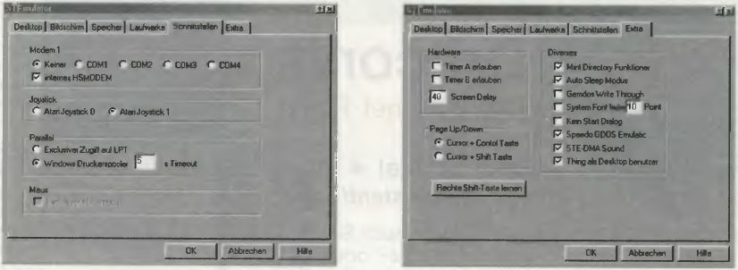 Über die Einstellung "Schnittstellen" kann man den Modem-Anschluß, Joystick-Anschlüsse etc. zuweisen. Hier wird auch zwischen einem exklusiven und einem Spooler-Timeout-Druckerzugriff differenziert. Ist der exklusive Modus gewählt. kann keine andere Windows-Applikation auf den Drucker zugreifen, ansonsten wartet der Spooler die vom Anwender eingestellte Zeit, bis er den Drucker nach der Verwendung unter dem STemulator wieder freigibt.