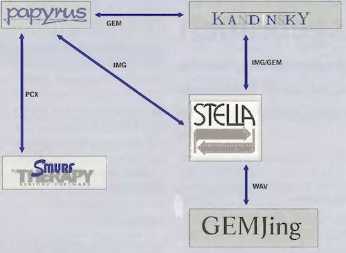 Ein etwas anderes Konzept steckt hinter dieser fruchtbaren Zusammenarbeit. Wie bekannt sein sollte, ist Stella ja nicht nur zur Grafikbearbeitung zu gebrauchen, sondern ist auch eine mächtige Dokument-Datenbank. Dabei ist es Stella grundsätzlich erst einmal „egal“, um welche Art Dokumente es sich hier handelt. Archiviert man allerdings etwa WAV-Dateien mit Stella, so bekommt man das Problem, daß Stella diese selbst nicht abspielen kann. Über das OLGA-Protokoll kann hierfür aber das beliebte Freeware-Programm Gemjing einspringen.