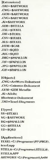 Was haben wir also gemacht? Genau: Wir haben festgelegt, welches Programm für die Bearbeitung eines Objektes zuständig ist. Wenn wir jetzt in papyrus eine IMG-Grafik selektieren und „OLGA-Objekt bearbeiten“ anwählen, wird Stella gestartet und öffnet sich selbst diese IMG-Datei ebenfalls (halt, noch nicht probieren, erst muß die OLGA.INF-Datei fertig sein!). Die Punkte [Objects] und [Types] lassen wir erst einmal unverändert und nähern uns [Applications]. Hier gibt man den Namen der oben festgelegten Programme noch einmal ohne das $-Zeichen, aber genau so geschrieben ein, und erklärt OLGA dann, wo auf der Festplatte sich dieses denn nun befindet. Bei mir steht etwa für Kandinsky folgendes: