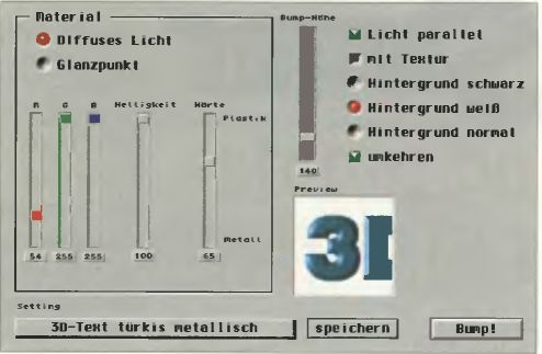 Die beiden Radiobuttons "Diffuses Licht" und "Glanzpunkt" schalten zwischen der Einstellung der Parameter fĂŒr die Grundhelligkeit und den Glanz der OberflĂ€che um. Eine genauere Beschreibung des Verfahrens wĂŒrden den Rahmen dieses Artikels bei weitem sprengen, daher sei mir erlaubt. Sie auf einen spĂ€teren Zeitpunkt zu vertrösten. Die Radiobuttons jedenfalls schalten die Funktion der darunter befindlichen Schieberegler zwischen Parametern fĂŒr diffuse Beleuchtung und Glanzpunkt um.