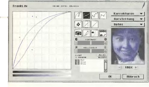 Daneben gibt es noch eine Vollversion vom FrankLIN, die mit einem Online-Vorschaufenster bei der Bilddatenmanipulation wesentlich schnelleres Arbeiten ermöglicht: Sie ändern im Editor eine Kennlinie, eine Kurve oder nur einen Teil davon, und im zoombaren Previewfenster sehen Sie direkt die Veränderungen. Das ist natürlich wesentlich praktischer, als nach jeder Änderung den Editor zu verlassen, um im Dokument die Änderung zu betrachten.