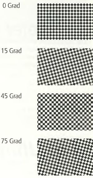 Dazu wiederum ist es wichtig, daß die Rasterpunkte nicht alle in der gleichen Art auf dem Ausdruck ausgerichtet sind. Sie müssen gegeneinander verwinkelt werden, und zwar so, daß beim Drucken keine Wiederholungsmuster der verschiedenen Rasterltnien entstehen können. Solche Wiederholungsmuster werden Moire (sprich: Moareh) genannt und sind in der Druckbranche sehr gefürchtet. Um sie zu vermeiden, benutzt man heutzutage üblicherweise folgende Winkelungen der Rasterlinien: