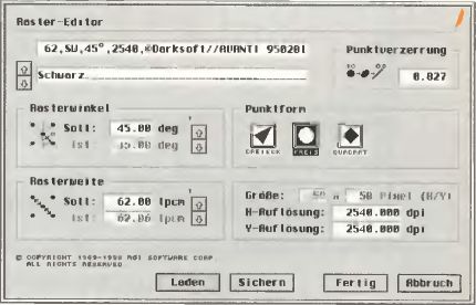 Die zugegeben recht komplexen theoretischen Zusammenhänge beim Rastern lassen sich im Rastergenerator allesamt einstellen, wobei der RasterCacheGenerator nicht nur runde, sondern auch rechteckige und dreieckige Punkte erzeugen kann. Darüberhinaus kann mit einer sog. Bias-Punktablenkung die Form des Rasterpunktes bis hin zu einer Linienform abgelenkt werden. Wenn Sie also runde Rasterpunkte mit einem Bias kleiner 1.0 erzeugen lassen, werden diese Rasterpunkte immer ein wenig elliptisch sein.