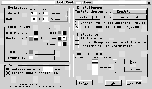 Das beiliegende Programm TWSMCONF.APP von Alexander Clauss ermöglicht es, den Workspace vielseitig zu konfigurieren. Die aktuelle Version 2.3 gibt es mit der Leser-CD 1/2000 oder über folgende Internet-Adresse: http://www.linguistik-uni-erla n -gen.de/%7Etommi/twsm.html