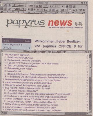 Für derartige Veröffentlichungen will R.O.M. im Frühjahr eine Freeware-Version von papyrus namens "papyrus VIEW" freigeben, die derartigen Publikationen beigelegt werden kann. Mittels papyrus VIEW werden auch Nicht-Besitzer von papyrus Dokumente im papyrus-Format -Text und Datenbank, auch mittels Hy-perOFFICE-Sprüngen gekoppelt - anschauen und drucken können.