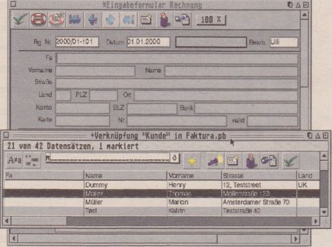 Angenehmer Nebeneffekt des zusätzlich geöffneten Tabellenfensters ist hierbei, das wenn bspw. ein Kunde, für den eine Rechnung angelegt werden soll und dieser noch gar nicht angelegt wurde, daß man die neuen Kundendaten gleich während der Herstellung der relationalen Verknüpfung noch neu anlegen kann - ein starkes Konzept, das es so einfach bisher noch nicht gab.