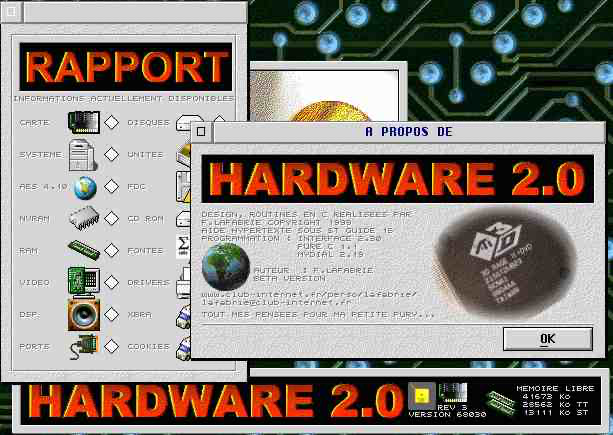 Mit Hardware 2.0 aus Frankreich liegt ein grafisch sehr ansprechendes System-Analysetool vor. Es bietet wie andere Programme Informationen aus allen Bereichen der zu untersuchenden Maschine. Laufwerke, Betriebssystem, NVDI/Speedo, Video, Treiber, Cookies und weiteres werden in Registerkarten ausgewertet. Das ganze ist grafisch sehr ansprechend gestaltet und erinnert sehr an ähnliche Programme aus dem Windows-Bereich wie die Norton Utilities. Natürlich sollte man schon entsprechende Farbunterstützung haben. Das größte Problem ist für den deutschen Anwender allerdings, daß das Programm nur in französischer Sprache vorliegt.