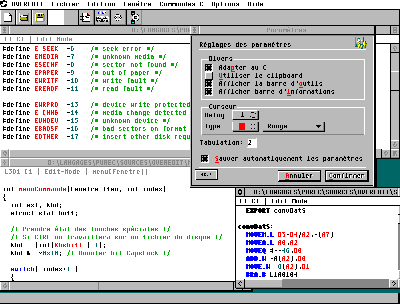 Overedit ist eine neue moderne Shell mit integriertem Editor für den Pure C Compiler. Overedit bietet sehr komfortable Funktionen, um mit dem C Source zu arbeiten. So kann über ein Popup, das mit der rechten Maustaste aufgerufen wird, eine Funktion im Source direkt angesprungen werden, CTRL+ALT liefert Informationen über die Argumente einer Funktion, korrespondierende Klammem werden direkt angesprungen, es gibt intelligente Such- und Ersetz-Funktionen. Projekte werden über einen eigenen Projekt-Manager verwaltet, alte Pure-C-Projekte geladen und natürlich können alle Optionen von Compiler, Linker, Assembler einfach gesetzt werden. Der Editor unterstützt außerdem ein konfigurierbares Syntax Highlighting und natürlich beliebige Fonts. Unter MagiC und MinT wird im Editor auch Drag & Drop unterstützt. Zum Betrieb wird ein AES >=3.99 (MagiC/Falcon/N.AES/MultiTOS) benötigt. Das Programm liegt in französischer und englischer Version vor.