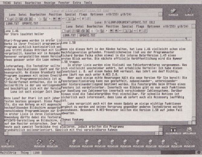 »Luna hat es endgültig geschafft, sich als eigenständige Applikation auf dem Atari ein individuelles Gesicht zu verleihen und stellt meiner Ansicht nach den zur Zeit leistungsfähigsten und modernsten Texteditor auf dieser Plattform dar.«