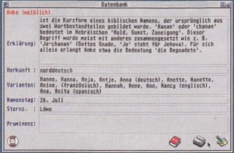 Nach dem Programmstart wird ein einem übersichtlichen GEM-Fenster der Namensindex dargestellt. Über zwei Popup-Menüs kann der Anwender nun entscheiden, ob die Namen abhängig vom Geschlecht und/oder der Herkunft dargestellt werden. Bei der Herkunft sind immerhin 26 Optionen abrufbar (u.a. alpenländisch, schottisch, südamerikanisch ... ). Nun können die Namen entweder mit Hilfe eines Scrollbalkens durchgesehen oder mit der Suchfunktion gezielt angesprungen werden. Auf schnellen Rechnern wird das Ergebnis schon bei der Eingabe des Namens angezeigt. Ist ein Name gefunden, so können per Doppelklick auf den Eintrag die dazu gespeicherten Informationen abgerufen werden. Diese werden in einem eigenen und wiederum übersichtlichen Fenster dargestellt. Wichtigster Punkt ist sicher die Erklärung zu dem Namen. Gleich darunter wird die Herkunft aufgezeigt, gefolgt von einigen Varianten. Sofern die Informationen dazu erhältlich sind, werden außerdem der Namenstag und das Sternzeichen angegeben. Als kleiner "Gimmick" informiert das Programm sogar über einige prominente Namensträger. Sehr hilfreich sind auch die Piktogramme, die am unteren Rand des Datenbank-Fensters angezeigt werden: Mit diesen wechselt man wieder ins Suchfenster, druckt die Informationen aus oder überträgt sie für eine Weiterverarbeitung in einem anderen Programm ins Klemmbrett.