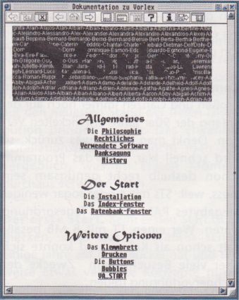 Vorlex finden Sie auf der Homepage des Entwicklers Gunnar Gröbel. In Kürze wird sich hier auch das Programm "Babyjahr" finden, das mit Vorlex zusammenarbeiten wird. Wenn Sie keinen Internetzugang besitzen, können Sie bei Interesse auch die Spezialdiskette 03/2000 beim Falke Verlag nachbestellen, auf der Vorlex enthalten ist ..