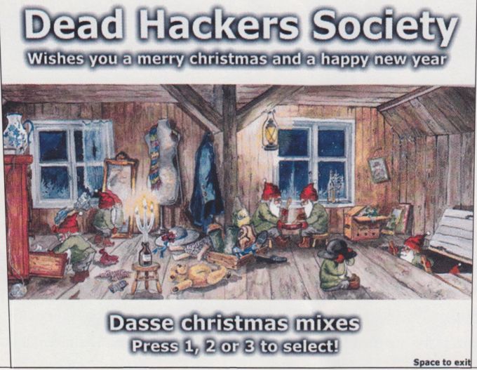 20. Dezember. Die logische Folge der (leider wieder auferstandenen) Spiee Girls sind die Spiee Boys. Und anstatt Musik macht diese schwedische Crew schrecklich schöne Fakedemos. Mit ihrem „XXX-Mass" wünschen Sie zu hämmernder Weihnachts-Chipmusik ein frohes Fest und einen guten Rutsch. www.dhs.nu (DHS Homepage)
